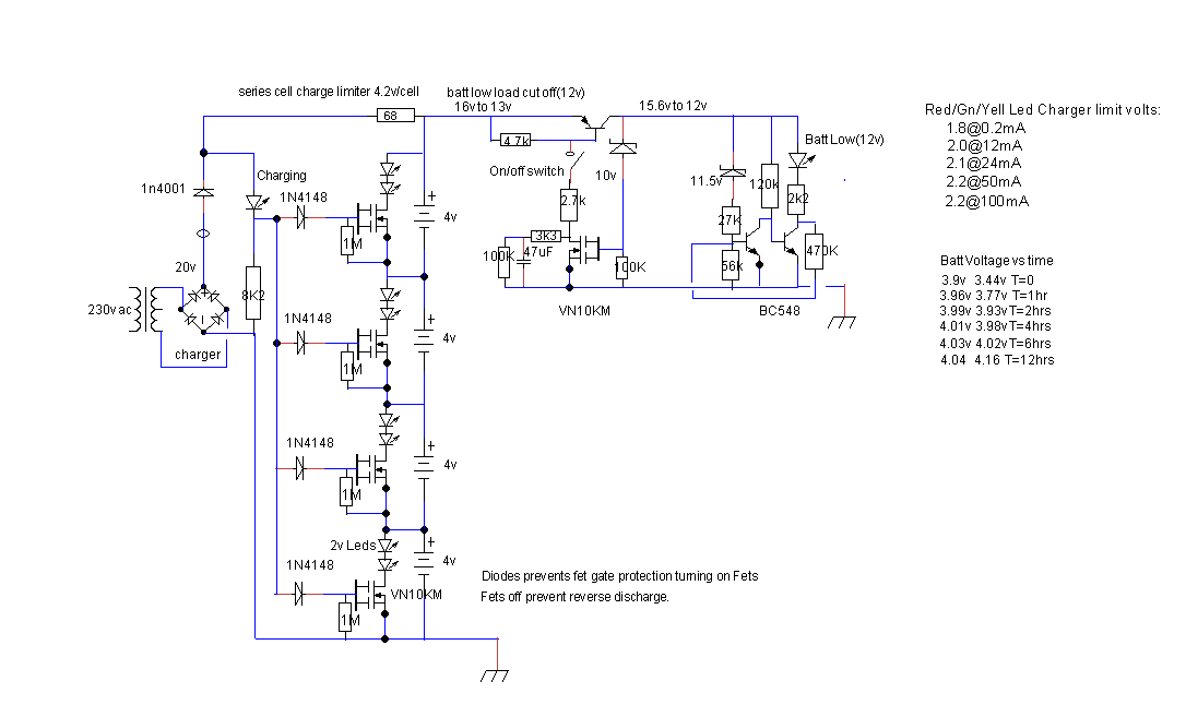The circuit includes Fet devices which switch on to bypass charging curent around the individual batteries. This only happens if the charger current source is applied and crucially if the battery has approached its voltage limit. I am using two 3mm led's in series to act as a bypass 'zener' which limit the battery voltage to just over 4 volts, one advantage being that you can actually see when bypass is in operation. The Led voltage vs current information is as shown on the circuit, obviously for a high current by pass the devices used will need to be changed or paralled together for greater currents. In addition the circuit supplied by the batteries must not be allowed to discharge to zero so a disconnect circuit & warning Led is included.